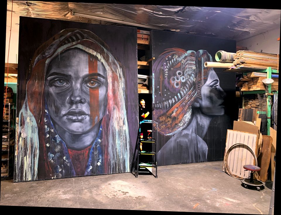 These 2 of 3, 12 ft tall by 9 ft wide canvases are by artist Kim Johnson. If you look really close, Thats Kim standing in the middle. Maybe you have a wall in mind for something this size?